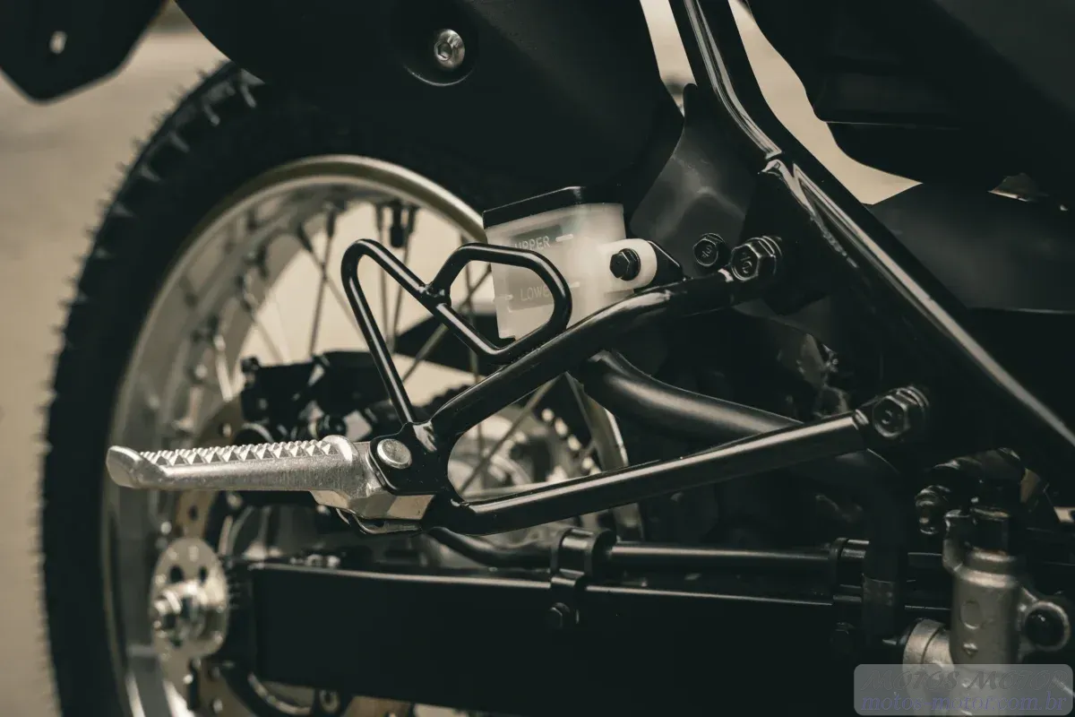 No quesito freios, a segurança é garantida por um sistema de freios a disco nas duas rodas, com ABS na dianteira. O disco dianteiro possui 240 mm de diâmetro e pinça de pistão duplo, enquanto o disco traseiro tem 220 mm e pinça de pistão simples. As rodas raiadas, com aros de aço, calçam pneus Pirelli MT 60, projetados para uso misto, oferecendo aderência em diferentes tipos de piso. As dimensões da moto são: comprimento de 2075 mm, largura de 821 mm e altura de 1167 mm, com altura do assento de 836 mm e distância do solo de 243 mm. O peso seco é de 126 kg, um quilo a menos que o modelo anterior, contribuindo para uma melhor agilidade. O tanque de combustível, com capacidade de 12 litros (incluindo reserva), sofreu redução de 1,5 litros em relação ao modelo anterior.